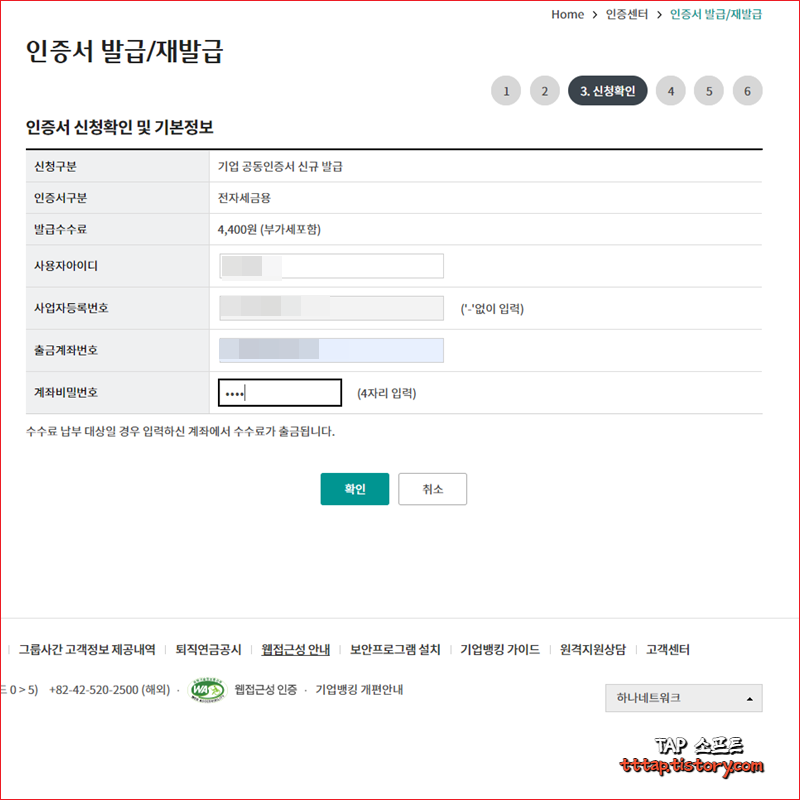 ▼ 6. 이제 인증서 신청 확인 및 기본정보를 입력해야 합니다. 부가세 포함 4,400원이 빠져나갈 계좌를 선택하고 계좌비밀번호를 입력합니다. 저는 하나은행 기업뱅킹용 출금계좌번호를 입력했습니다.