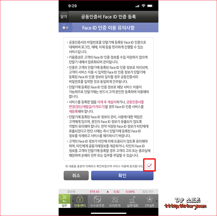 ▼ 1. 공동인증서 등록시 필요한 유의사항을 볼 수 있습니다. 다소 보안에 무책임한 경향이 있으니 개인적으로 잘 판단하시기 바랍니다. 약관을 숙지했다면 체크박스에 체크를 하고 확인 버튼을 선택합니다.