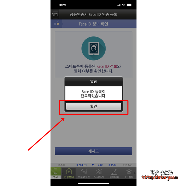 ▼ 1. 애플의 Face ID 등록이 완료되면 다음과 같은 팝업이 뜹니다. 확인을 눌러 종료해줍니다.