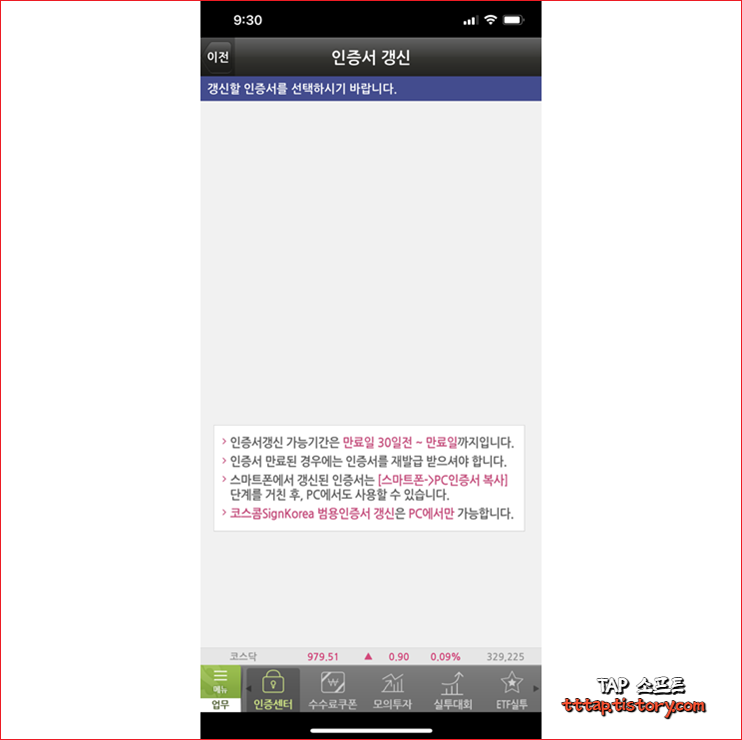 지금까지 영웅문 S에서 인증서를 갱신하는 방법을 알아봤습니다. 매우 간단하고 쉽습니다. 그런데 만약 영웅문 PC 버전을 위해서 인증서를 다시 받아야 한다면 스마트폰으로 내보내기를 해서 PC에서 받아봐야 합니다. PC를 이용해서 인증서를 받을 경우는 그 반대가 되겠죠. 만약 스마트폰에 인증서를 가져오려면 다음 글을 참고하시면 좋습니다.