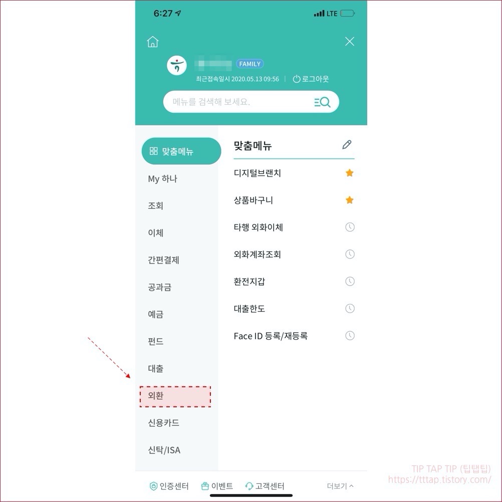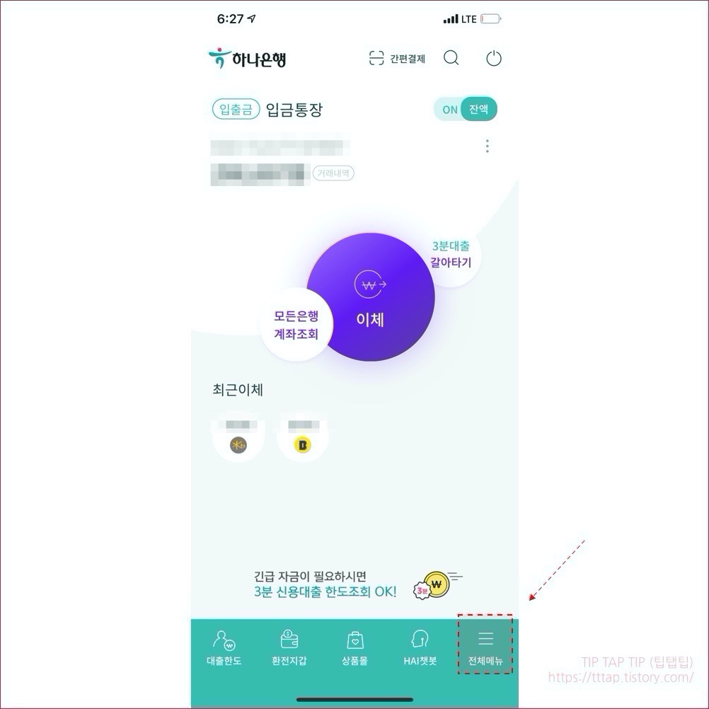 ▼ 1. 이제 부터 내 일반 원화통장에서 외화로 환전하는 방법을 알아보겠습니다. 저는 달러 USD로 환전을 할 생각입니다. 테스트로 1000원만 해보겠습니다. 하나은행 앱에서 전체메뉴로 진입합니다.