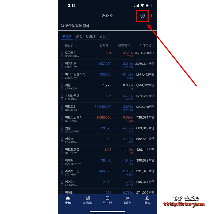 ▼ 1. 우선 거래소 화면 (메인화면)에서 우측 상단에 톱니바퀴 모양의 설정 버튼을 눌러줍니다.