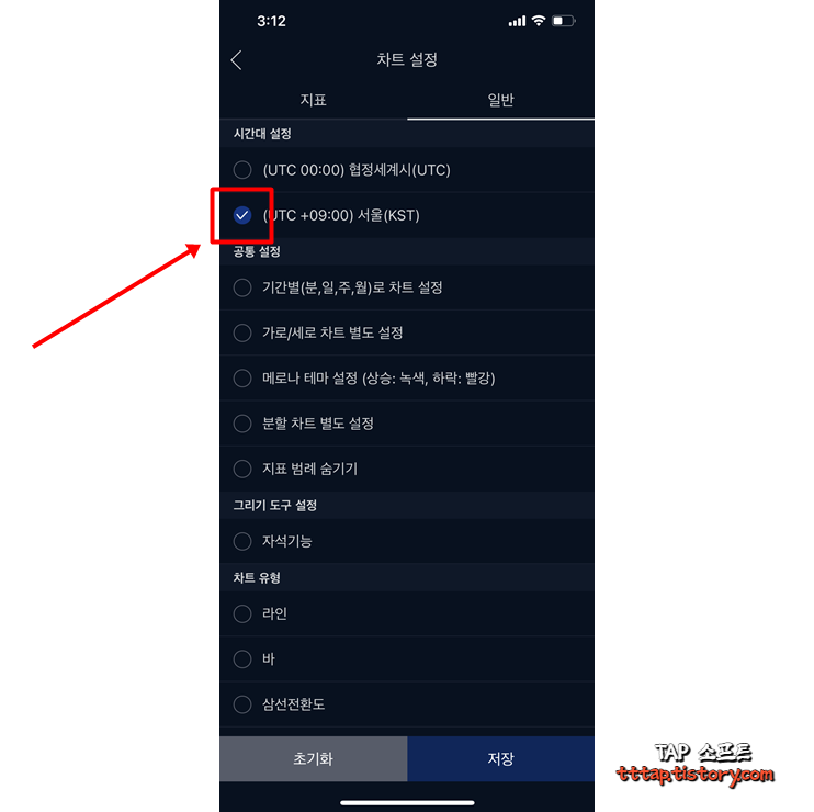 ▼ 3. 차트 설정 > 일반 > 시간대 설정에서 협정 세계시(UTC)에서 서울 KST로 변경해줍니다. 참고로 협정 세계시란 GMT 그리니치 평균시라고도 합니다. 영국에 있는 시계를 기준으로 우리나라는 9시간 떨어진 시간을 가지고 있습니다.