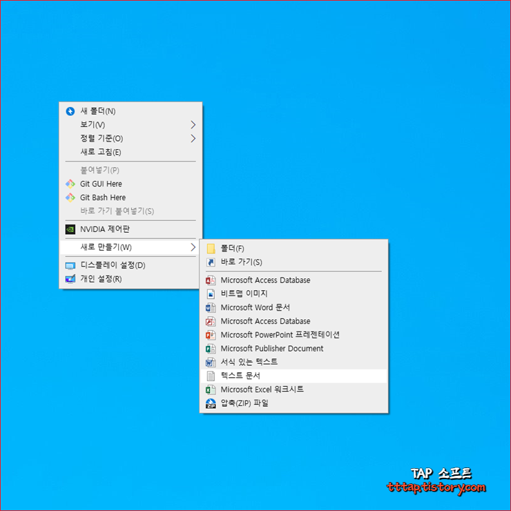 ▼ 1. 바탕화면에 파일을 하나 만들어 보겠습니다. 오른쪽 버튼을 누르고 새로 만들기 탭에서 텍스트 문서를 선택합니다.