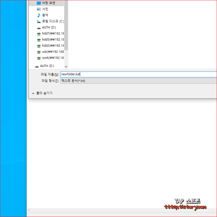 ▼ 4. 원하는 파일이름을 적고 확장자를 bat으로 지정합니다. (예 newfolder.bat)