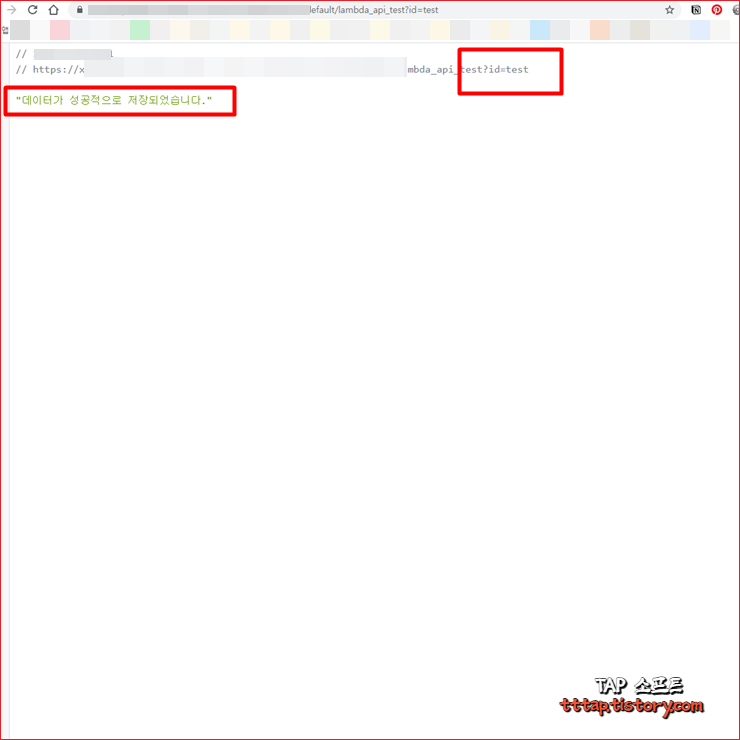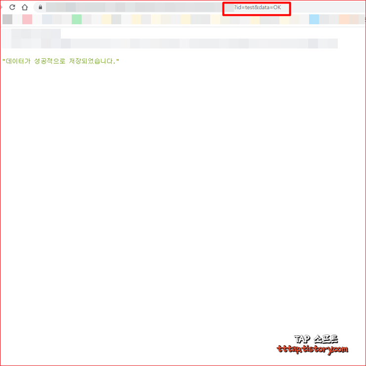 ▼ 11. 이번에는 쿼리스트링에 id 값을 포함시켜보겠습니다. URL 끝에 ?id=test 를 추가합니다. 그럼 응답 값으로 데이터가 성공적으로 저장되었습니다. 라는 메시지와 함께 200코드가 응답합니다.