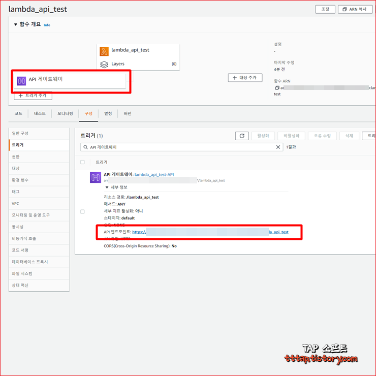 ▼ 9. 이제 코드가 잘 적용되었는지 확인하기 위해서 트리거로 설정한 API 게이트웨이의 엔드포인트로 이동합니다. API 게이트웨이의 상세메뉴를 눌러서 URL링크를 클릭합니다.