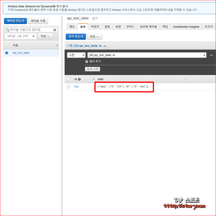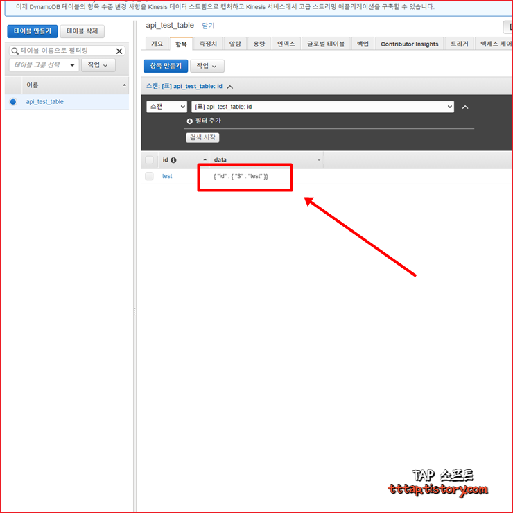 ▼ 12. 이제 다시 다이나모 DB 테이블 페이지로 이동해보면 새로운 값이 포함된 것은 확인할 수 있습니다. 단순 id 값만 추가되었기 때문에 이번에는 data 라는 값을 추가해보겠습니다.
