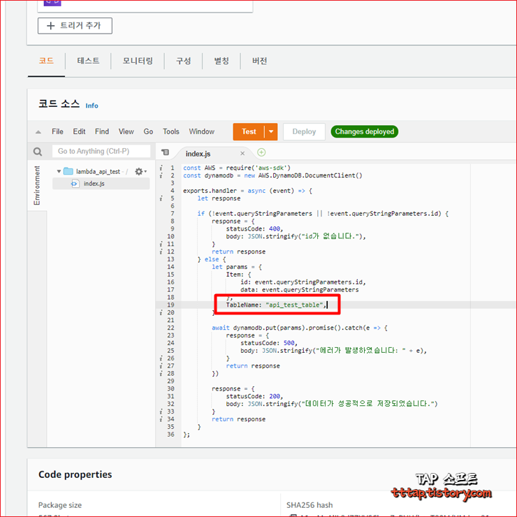 ▼ 8. 다음과 같이 코드를 입력하고 Deploy 버튼을 눌러서 새로 코드를 적용합니다.