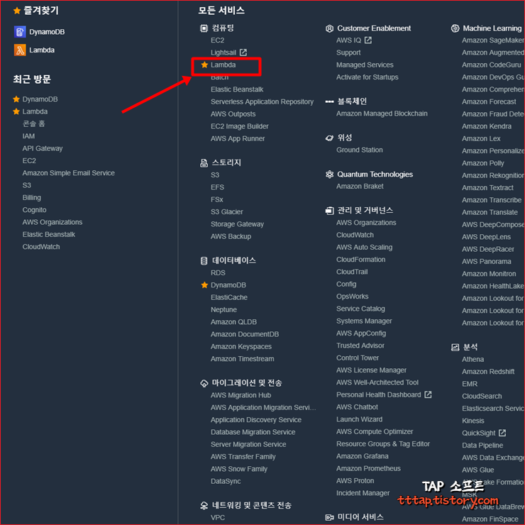 ▼ 5. DynamoDB 테이블이 잘 만들어졌다면 다시 AWS 전체 메뉴에서 Lambda 메뉴를 선택해서 람다 함수를 편집합니다.