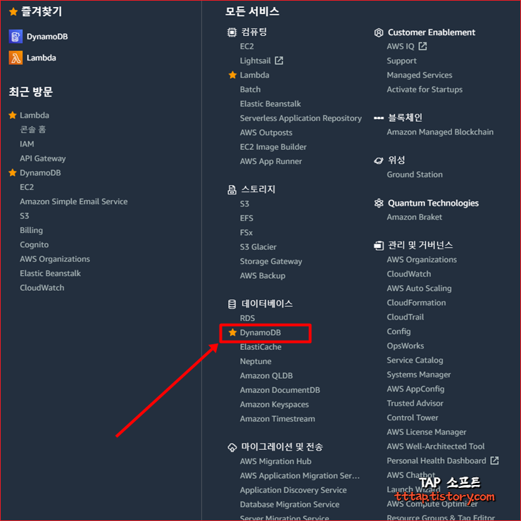 ▼ 1. DynamoDB의 새로운 테이블을 추가하기 위해서 AWS 전체 메뉴에서 DynamoDB를 선택합니다.
