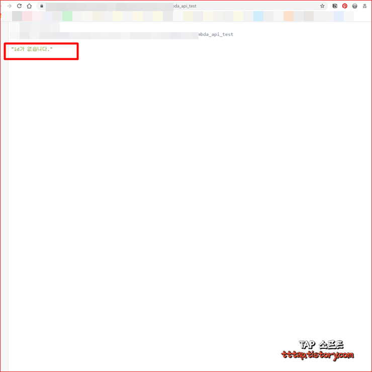 ▼ 10. 다음과 같이 id가 없습니다. 라고 메시지가 출력됩니다. 위에 코드에서 보시다시피 쿼리스트링에 id값이 포함되어 있지 않는다면 statusCode 400과 함께 id가 없습니다. 라고 응답합니다.
