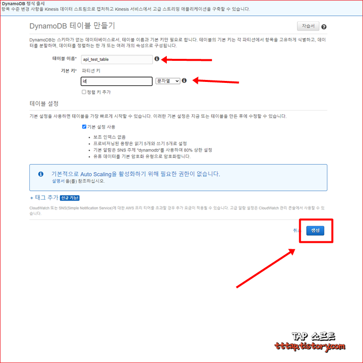 ▼ 3. DynamoDB 테이블 만들기에서 테이블 이름을 api_test_table이라고 입력하고 기본키를 id로 입력해줍니다. 그리고 하단의 생성 버튼을 눌러 테이블을 생성합니다. 약간의 시간이 소요되고 새로운 테이블이 생성됩니다.