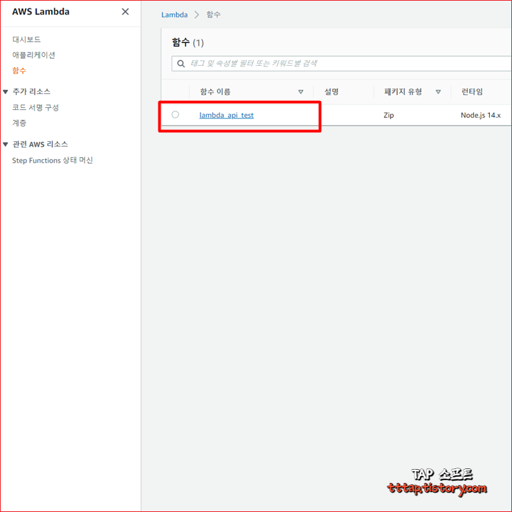 ▼ 7. 이전에 만들었던 lambda_api_test 를 선택합니다. 패키지 유형은 Zip 이고 런타임은 Node.js 14.x 입니다.