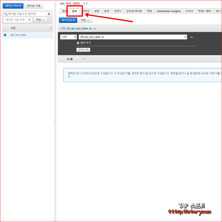▼ 4. 테이블 페이지에서 왼쪽에 api_test_table 이 선택된 것을 확인하고 상단의 항목 메뉴를 눌러봅니다. 그럼 해당 테이블의 데이터를 볼 수 있습니다. 아직 새로운 데이터가 없기 때문에 필드가 없는 것을 확인할 수 있습니다.