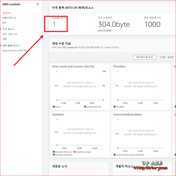 ▼ 6. 람다 메인 페이지에서 기존에 만든 람다 함수를 선택합니다. 현재 함수가 하나뿐이 없어서 1로 표시됩니다.
