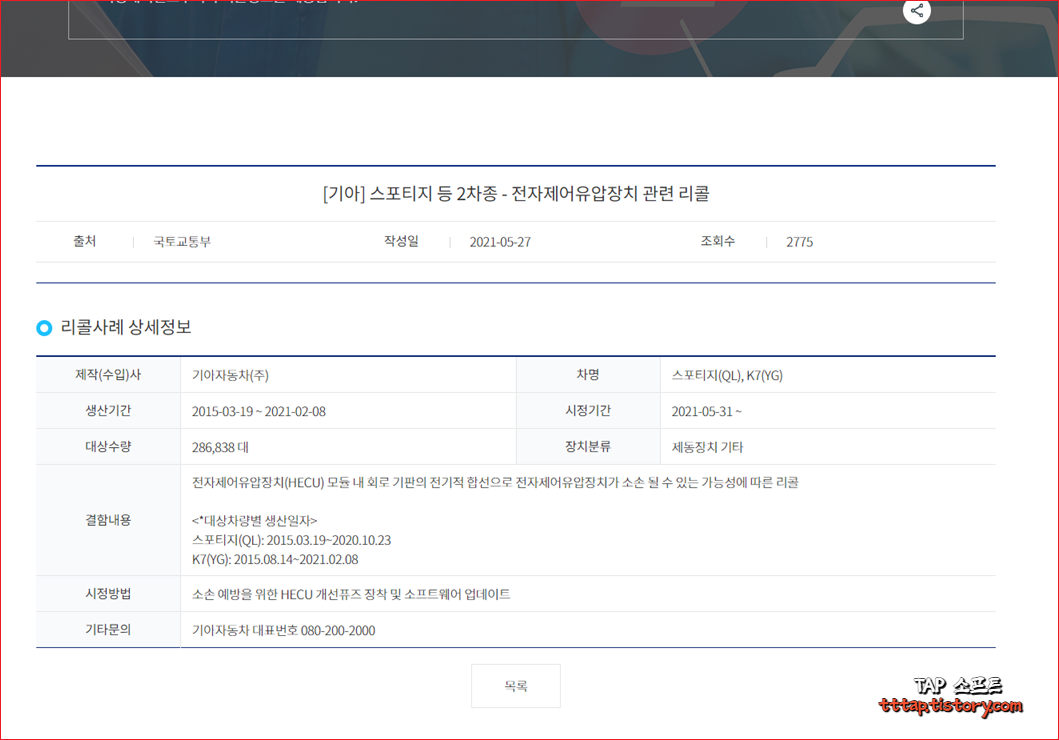 ▼ 3. 상세 페이지로 이동하면 현재 리콜 대상이 되는 차량의 상세 정보를 볼 수 있습니다. 2015년에서 2020년 사이에 생산된 스포티지QL 모델과 K7(YG) 모델이 대상이며 HECU 개선 퓨즈를 장착하고 소프트웨어 업데이트로 해당 문제를 고칠 수 있는 것 같습니다. 대상 수량도 나오는데요. 약 28만 대 정도 되네요. 제동장치에 관련된 부분이니 필히 수리를 받아야겠습니다.