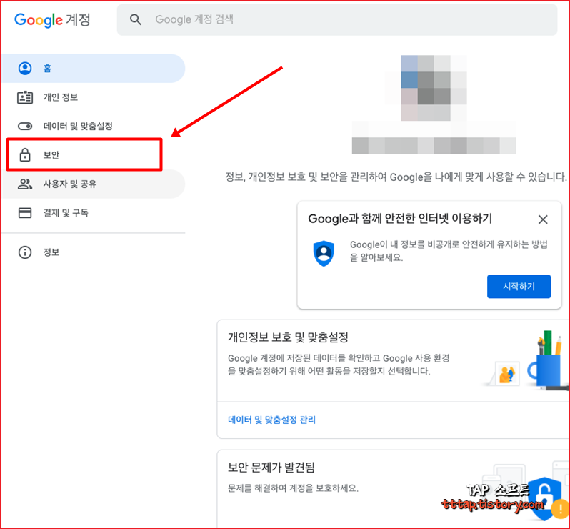 ▼ 3. Google 계정 페이지로 이동하면 좌측 메뉴바에서 보안 버튼을 누릅니다.