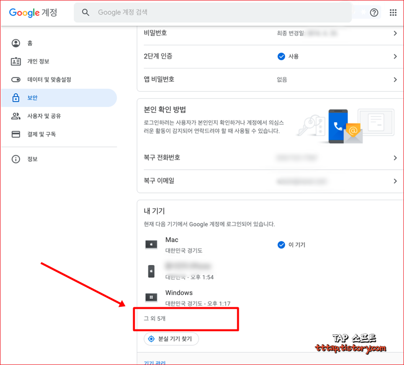 ▼ 5. 보안 페이지에서 아래로 조금 스크롤 하면 내 기기 라는 메뉴를 볼 수 있습니다. 그 외 5개 를 누르던지 특정 단말기를 눌러서 상세 메뉴로 이동합니다.