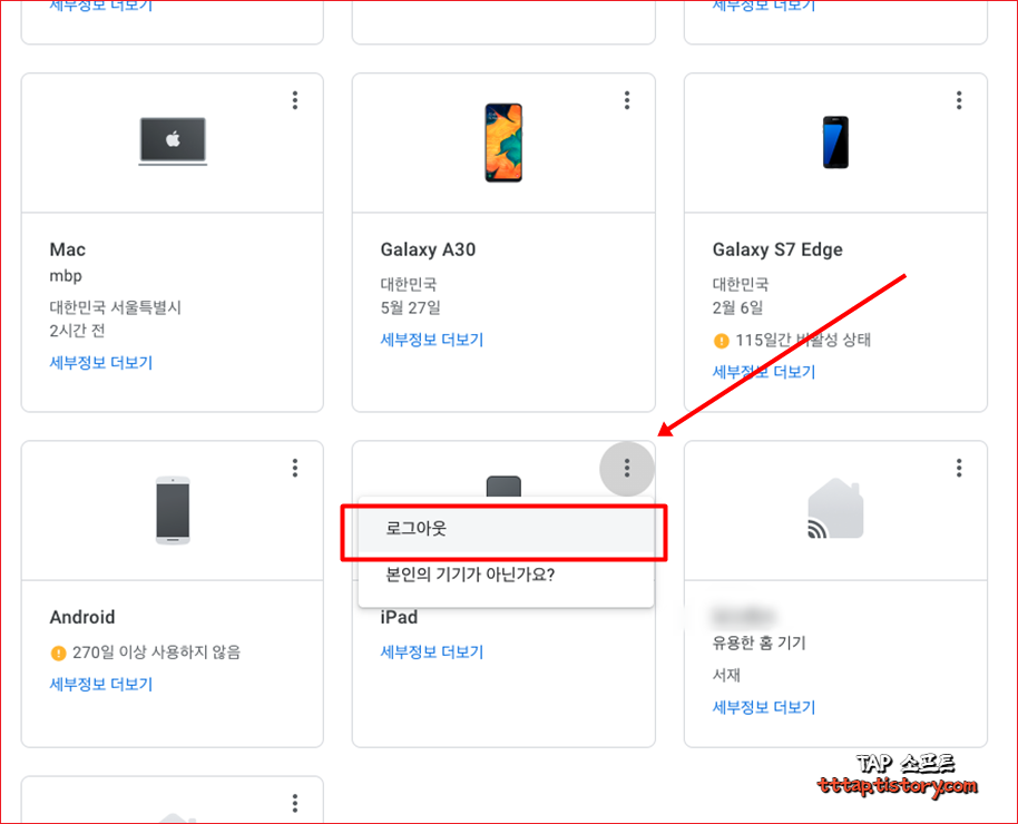 ▼ 8. 이제 로그인한 기기 쪽으로 이동해서 로그아웃할 기기의 더보기 메뉴를 누르고 로그아웃을 선택하면 해당 단말기가 로그아웃이 됩니다.