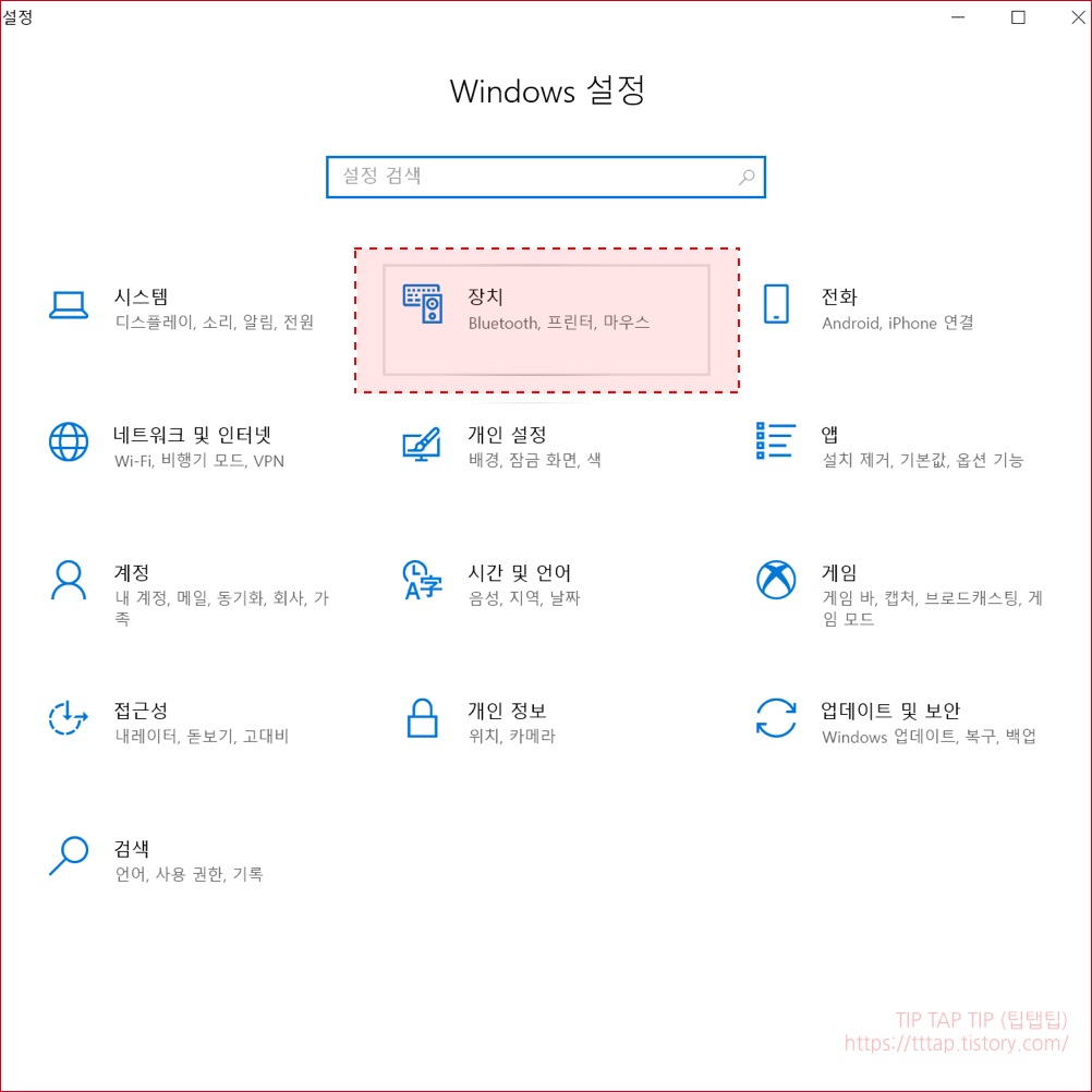 ▼ 1. Windows 설정 창을 열고 장치 메뉴를 선택합니다. 윈도우 버튼을 누르고 검색을 하거나 설정 아이콘을 누르면 됩니다.