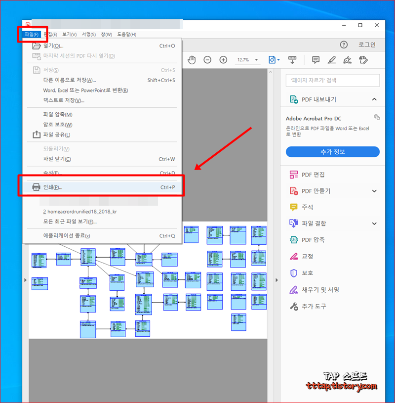 ▼ 3.아크로뱃 리더로 PDF 파일을 열었다며면 파일 메뉴에서 인쇄 버튼을 누릅니다 Ctrl+P 인쇄 단축키를 사용하셔도 됩니다.