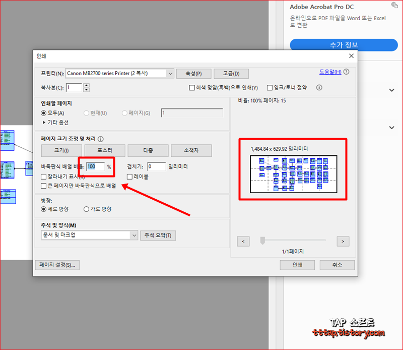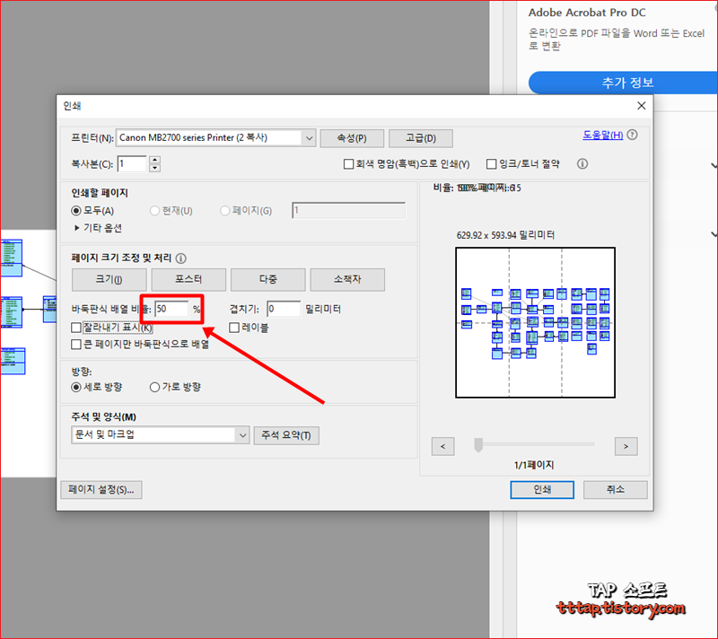 ▼ 6. 때문에 다음과 같이 적절한 비율로 변경해줍니다. 이 PDF 파일의 경우 50%로 변경하면 6장으로 출력이 가능하네요. 말 그대로 분할해서 출력해줍니다.