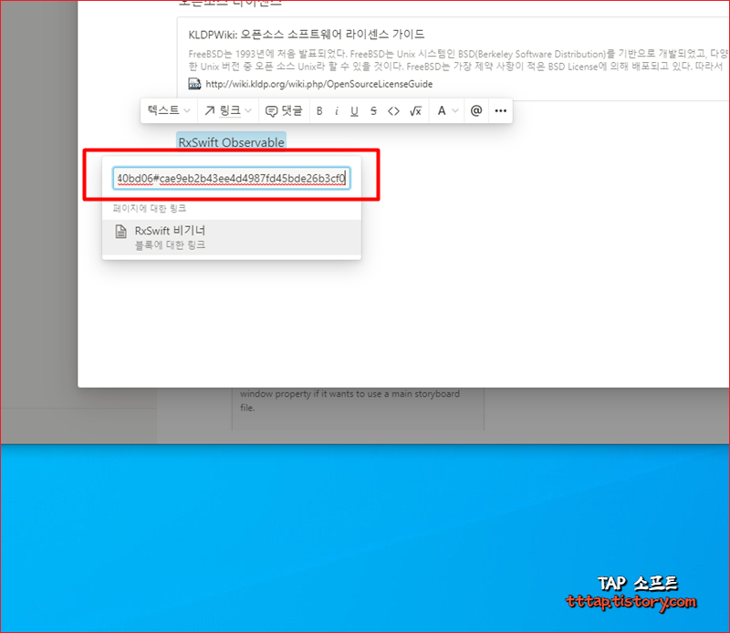 ▼ 3. 링크를 복사했다면 이번에는 원래 페이지로 이동해서 아까와 같이 블록을 선택한뒤에 툴바 메뉴에서 링크 버튼을 눌러줍니다.