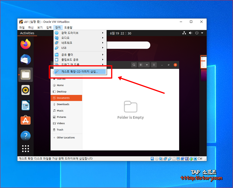 ▼ 2. 상단 메뉴바 목록에서 장치 > 게스트 확장 CD 이미지 삽입 메뉴를 선택합니다.