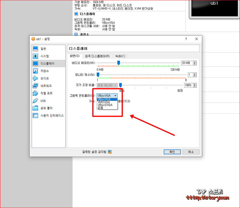 ▼ 9. 설정 메뉴에서 디스플레이를 선택하고 그래픽 컨트롤러를 VBoxVGA로 변경해줍니다.