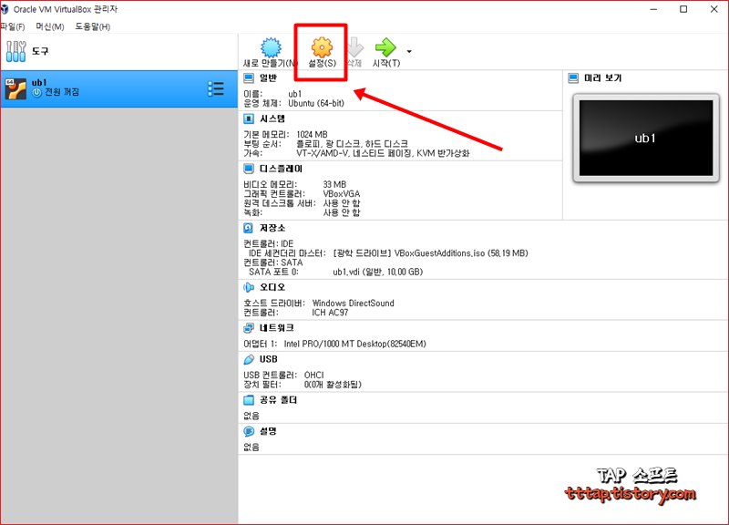 ▼ 8. Virtual Box 관리자에서 해당 운영체제를 선택하고 설정 버튼을 눌러줍니다.