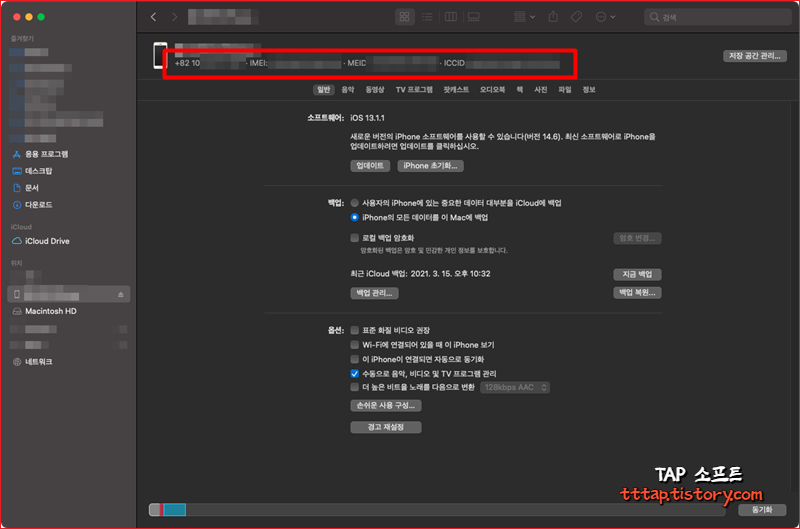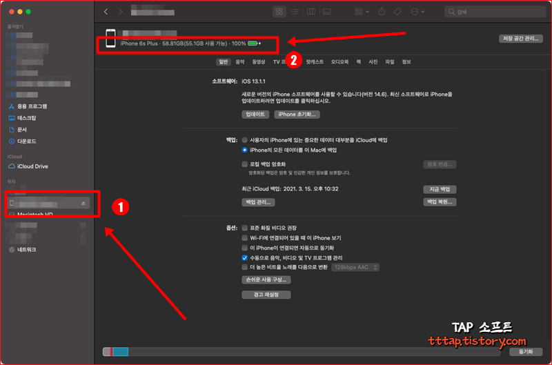 ▼ 1. 다음과 같이 아이폰을 맥 컴퓨터에 연결한 뒤에 좌측 메뉴에서 아이폰 디바이스를 선택합니다. 그러면 상단에 아이폰 기본 정보를 볼 수 있습니다.