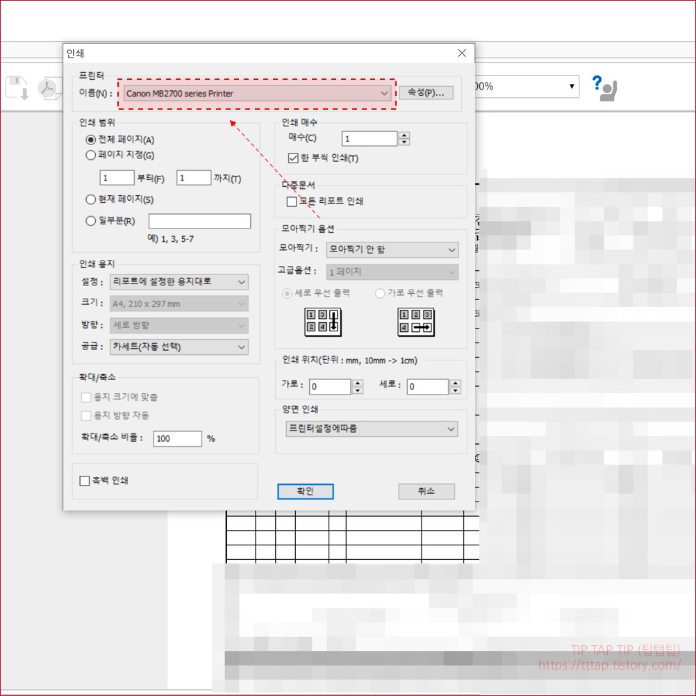 ▼ 2. 다음은 출력 설정 화면입니다. 이 곳에서 다른 것은 건들이지 않고 프린터만 변경합니다.