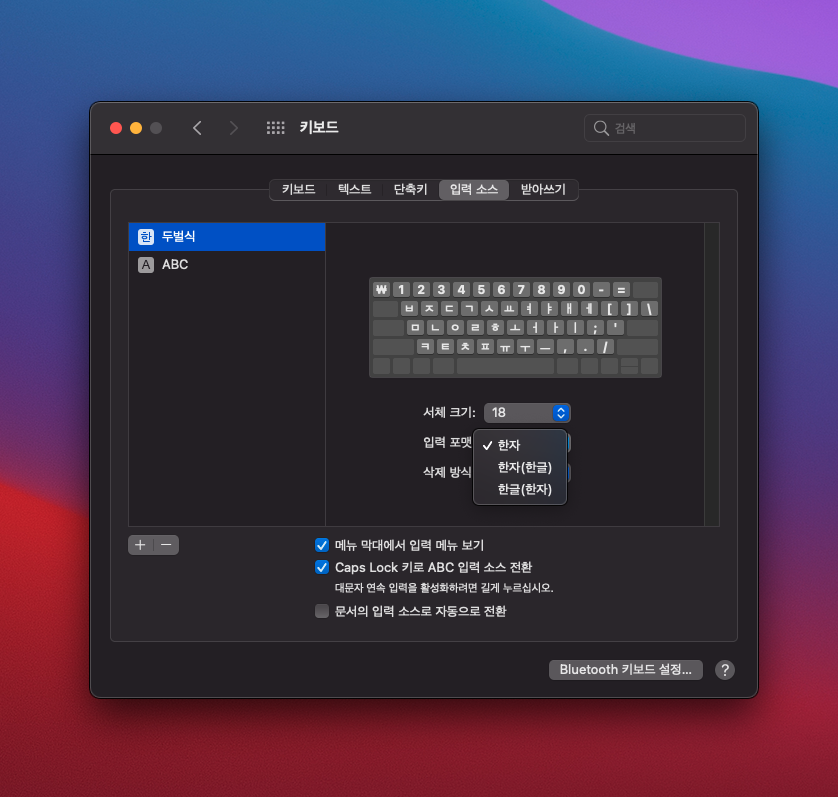 맥에서 한자 지원을 하려면 입력 포맷에 한자로 선택을 해야 합니다.