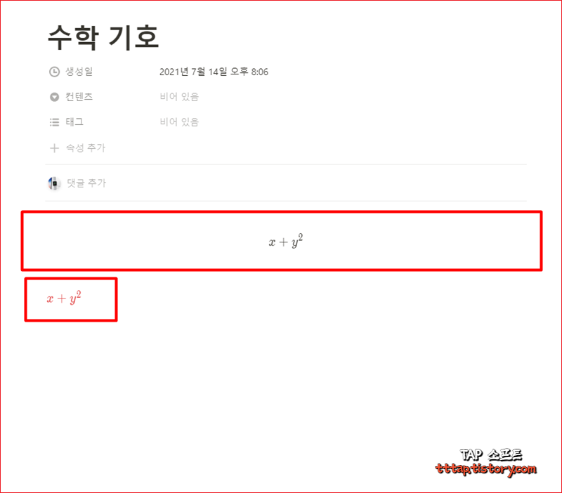 ▼ 7. 다음과 같이 수학 공식 블록은 한 블록 전체를 차지하며 높이도 약간 있는 블록이 생성됩니다. 하지만 인라인 수학 블록의 경우 일반 텍스트와 연결해서 사용할 수도 있고 영역도 일반 텍스트와 동일합니다.
