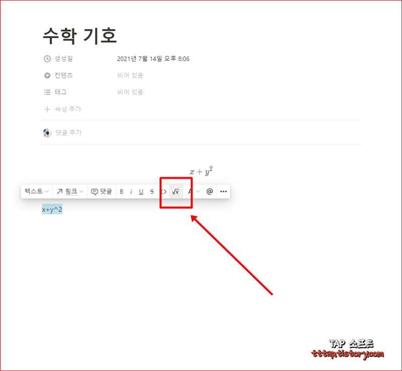 ▼ 4. 전체 선택을 하고 다음과 같이 툴팁 메뉴에서 루트 x 모양의 아이콘을 눌러줍니다. 그럼 위의 수학 블록 기호처럼 수학적 기호로 표기되는 것을 보실 수 있습니다. 이게 인라인 스타일의 수학 기호입니다. /수학 이라고 입력한 뒤에 선택하고 값을 입력해도 같은 결과를 확인 할 수 있습니다. 물론 이렇게 먼저 쓰고 변환하는 것이 편리합니다. 단축키는 Ctrl + Shift + E 입니다.