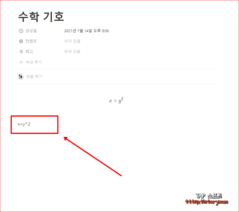 ▼ 3. 이번에는 일반 문자열을 인라인 수학 기호로 변경해보겠습니다. 다음과 같이 문자열을 입력해줍니다. x+y^2