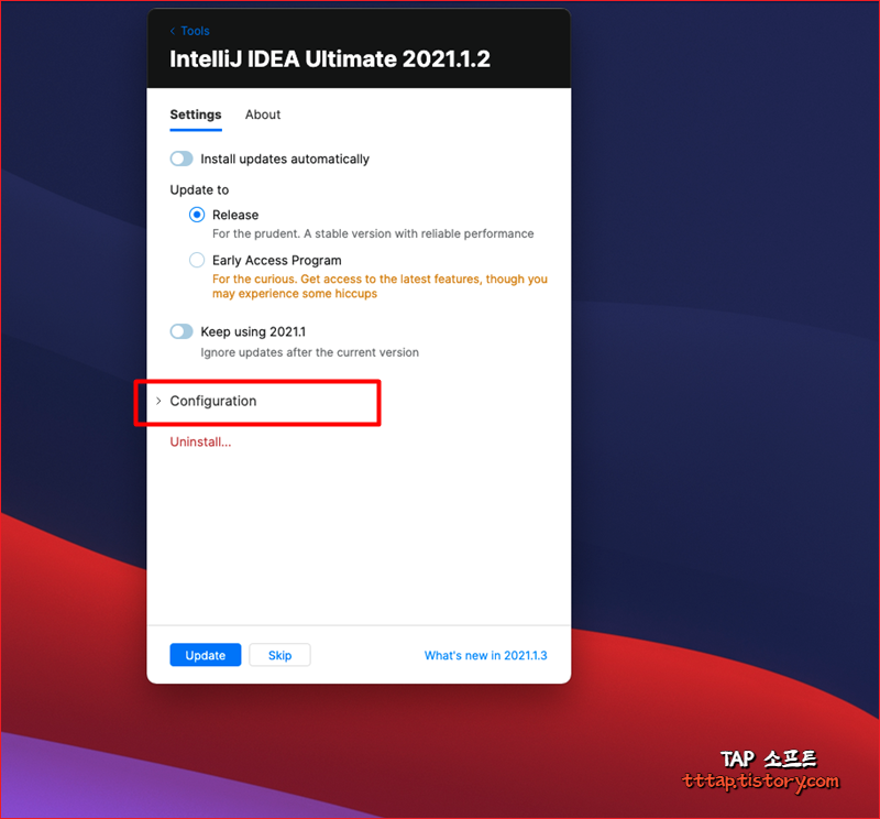 ▼ 2. 설정메뉴로 이동해서 Configuration 상세메뉴를 펼쳐줍니다. 실수로 Uninstall을 누르면 안돼요.