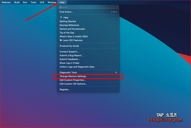 ▼ 4. 이번에는 직접 IntelliJ 툴에서 메모리 힙 사이즈 크기를 변경해보겠습니다. Help > Change Memory Settings 메뉴를 누릅니다.