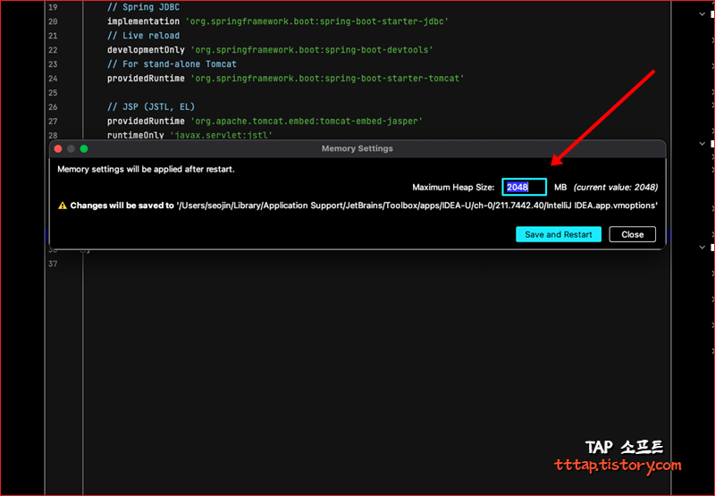 ▼ 5. Memory Settings 창이 뜨면 Maximum Heap Size의 사이즈 값을 변경해줍니다. Save and Restart 버튼을 눌러 인텔리 제이를 재 실행합니다.