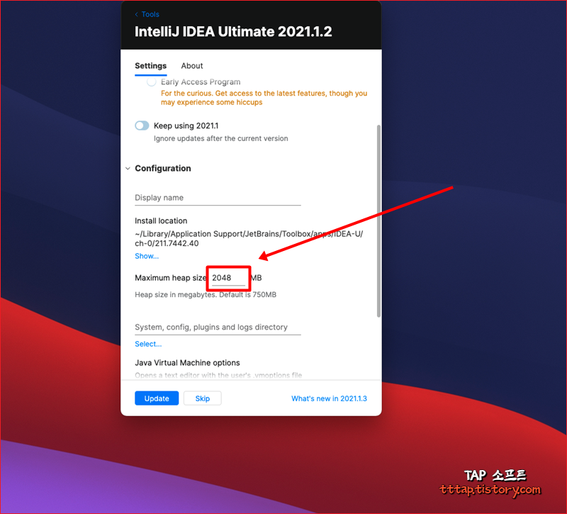 ▼ 3. 상세 설정에는 몇 가지 기능이 있는데 그중 중간에 위치한 Maximum heap size _____ MB의 값을 변경해줍니다.