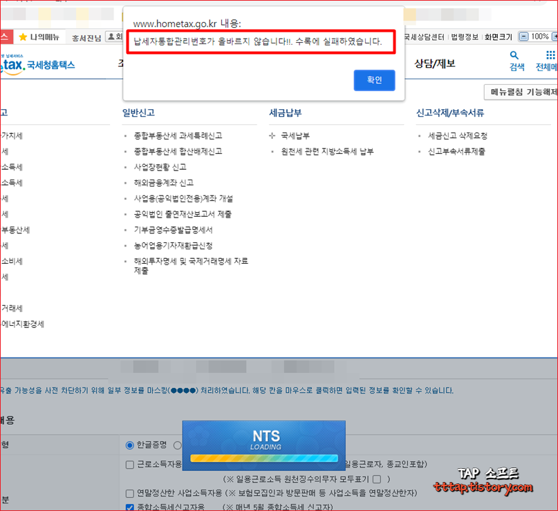 [ 홈택스 ] 납세자통합관리번호가 올바르지 않습니다 - 에러 Error