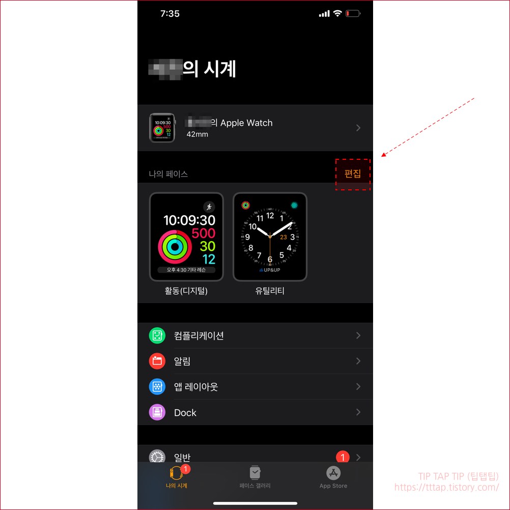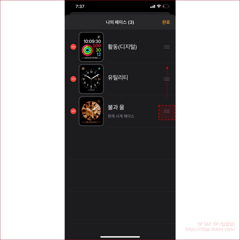 ▼ 7. 다음은 시계의 순서를 변경할 차례입니다. 현재 시계 페이스로 설정하게 되면 기본 화면으로 설정이 되며 여려 화면과 같이 사용할 수 있는데요. 순서를 바꿀 수도 있습니다. 편집 버튼을 터치합니다.