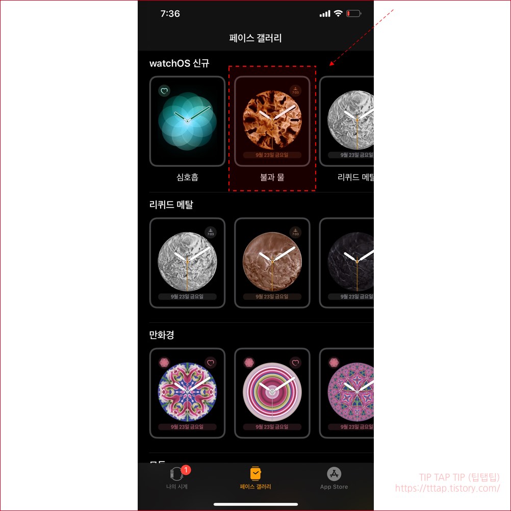 ▼ 2. 페이스 갤러리에는 다양한 디자인이 있는데요. 제 애플워치는 구형이라서 신규로 추가된 watchOS 페이스가 많이 없습니다. 아무튼 여기서 원하는 페이스를 선택합니다. 저는 불과 물이라는 페이스를 선택했습니다.