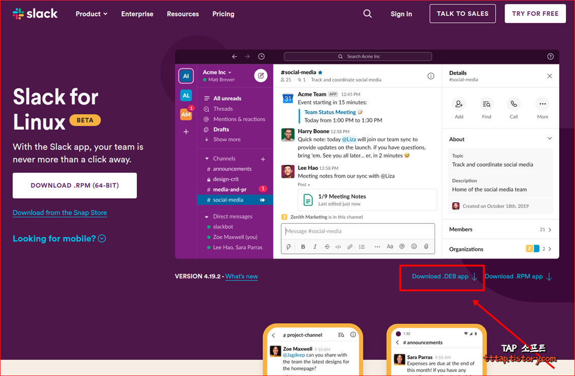 ▼ 1. 리눅스 버전 다운로드를 위해 슬랙 Linux 다운로드 페이지로 이동합니다. DOWNLOAD .RPM (64-bit) 파일을 다운로드 받지 마시고 아래쪽에 작게 있는 Download DEB.app 파일을 다운로드 합니다.