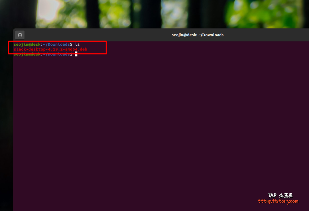 ▼ 2. 다운로드가 완료되면 다운로드한 폴더 위치로 가서 파일을 확인합니다. ls 명령을 통해서 slack-desktop-4.19.2-amd64.deb 과 같은 파일을 확인할 수 있습니다. (4.19.2 는 버전명이며 다운로드 시점에 따라서 다를 수 있습니다.)