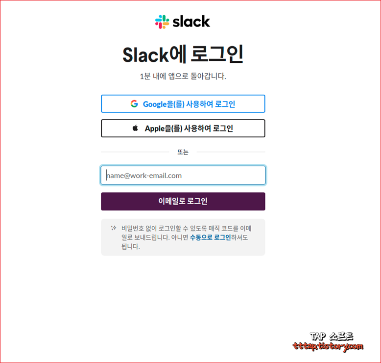 ▼ 6. 웹 브라우저가 뜨고 로그인을 위해 다음과 같은 페이지가 열립니다. 애플이나 구글로 로그인하게 되면 로컬의 슬랙 앱이 열리면서 로그인 처리가 완료됩니다.