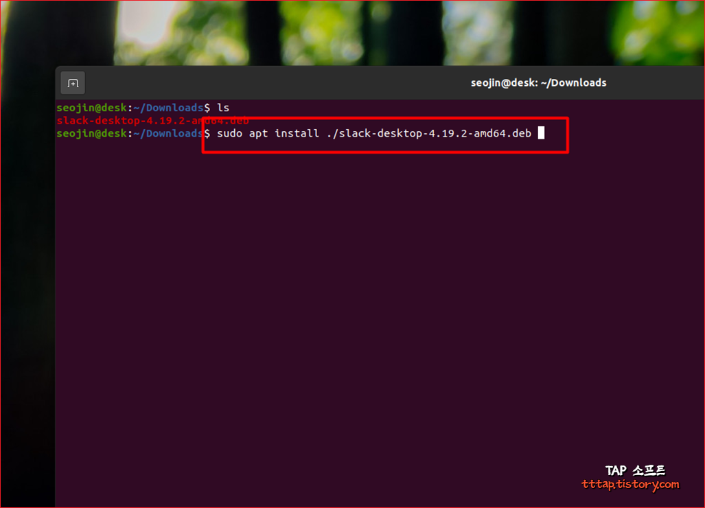 ▼ 3. 다음 sudo apt install 명령어를 사용해서 Slack 패키지를 설치합니다.
