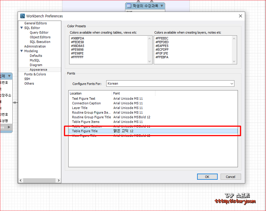 ▼ 3. 다음과 같이 Modeling 설정 메뉴에서 Appearance 탭을 찾아서 선택해줍니다. 그런 뒤 Fonts 메뉴를 볼 수 있는데 Configure Fonts For : 메뉴에서 Default(Western) 을 Korean으로 변경해줍니다.