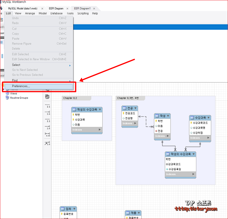 ▼ 2. 다음과 같이 MySQL Workbench 메뉴중에 Edit 메뉴를 선택한 뒤에 제일 밑에 있는 Preference(설정) 메뉴를 눌러줍니다.